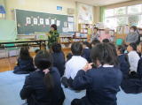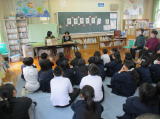 3校時に下学年、4校時には上学年の図書ボランティアの11名の方々によるお話会がありました。紙芝居や大型絵本など工夫をしていただき、子どもたちは楽しいお話の世界に浸りました。お話会の後、全学年図書ボランティアの方々を囲んで給食を食べました。昔の給食の話をしていただいたり、子どもの頃の話をしていただいたりしました。