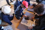 はね返した日光は、鏡を使い、1枚の時、2枚の時と枚数が増えると当たったところの温度がどのように変化するか調べました。集めた光は黒い紙と虫眼鏡を使って実験しました。すぐに煙が出て紙に穴が開き、びっくりしていました。