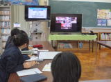 下学年には、「ひとあし ひとあし」「あまがえるの あおちゃん」「ごきげんのわるい コックさん」「おじいちゃんの ごくらく ごくらく」「たなばたまつり」の5つのお話を聞かせてくださいました。ボランティアさんとのかけ合いを楽しみながら聞くお話、悲しいけれど心温まるお話、七夕にちなんだお話など、いろいろなジャンルのお話の面白さを感じながら、子どもたちはモニターに映した絵本や紙芝居を食い入るように見て、真剣にお話に聞き入っていました。