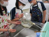 この日は5年生がはじめて家庭科室で学習をしました。家庭科室の使い方を学習した後、初めてのクッキングで「緑茶」の入れ方を学びました。どの子も真剣に先生の話を聞き、上手に急須からお茶を入れることができました。