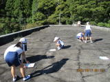 3年生が、理科「太陽とかげ」の学習をしています。みんなで伊香具小学校の屋上に上がり、朝9:00をスタートに、10:00,11:00と、1時間ごとに15:00まで、かげのでき方の定点観測をしました。