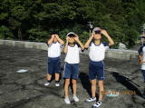 素晴らしい秋晴れの1日で、屋上から見る木之本の町の景色も素晴らしく、みんなで楽しく学習を進めることができました。遮光板で太陽を見て「あかい!まんまる!」と大はしゃぎでした。観察をしたあと、国語科の学習「ちいちゃんのかげおくり」にならい、みんなでかげおくりをして楽しんでいました。
