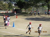 この日は4年生が朝早くから「やまのこ」に出かけたので、1~5・6年生の子どもたちが「おにごっこ」をしました。
