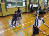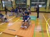 3・4年生が、5校時に車いす体験をしました。福祉学習を進める中で、これまでに様々な方と交流し、障がいのある方の思いを理解できるようになってきています。この日は車いすを利用している人をしっかりサポートしたい思いを持ち、体験学習に臨みました。まず、車いすの仕組みと操作について説明を聞き、それから実際に2人組で車いすに乗る子と車いすを押す((介助する)子に分かれて体験しました。車いすの重さや操作の難しさ、段差がある時の困難さ等を感じ、車いすで生活されている方の気持ちに少し近づくことができました。障がいのある方の理解から具体的にできる手助けへと学習が進み、真剣に学ぶことができました。